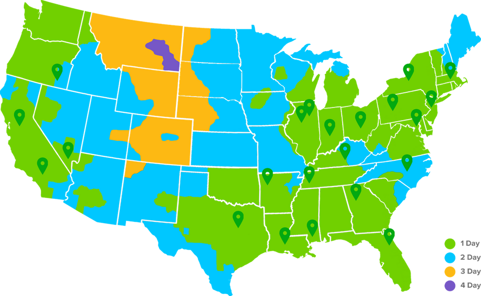 Experience lightning-fast shipping with our affordable and reliable peer-to-peer network of US-based fulfillment centers, letting you deliver anywhere in the continental US in as little as 1 or 2 days.