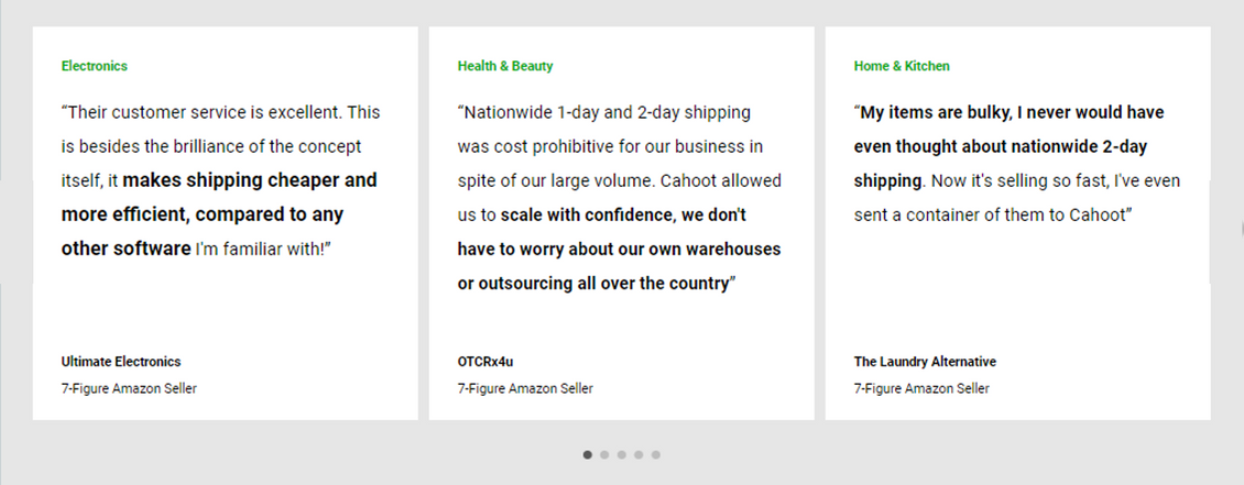“Nationwide 1-day and 2-day shipping was cost prohibitive for our business in spite of our large volume. Cahoot allowed us to scale with confidence, we don’t have to worry about our own warehouses or outsourcing all over the country