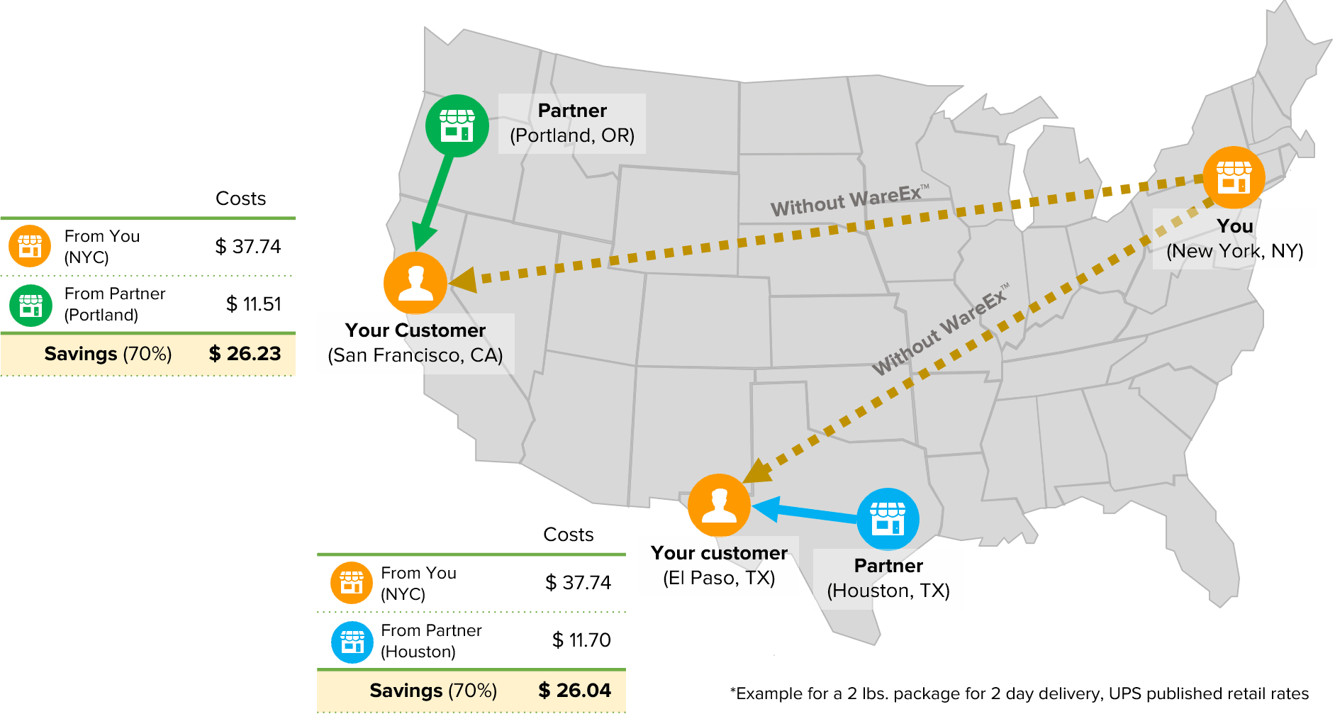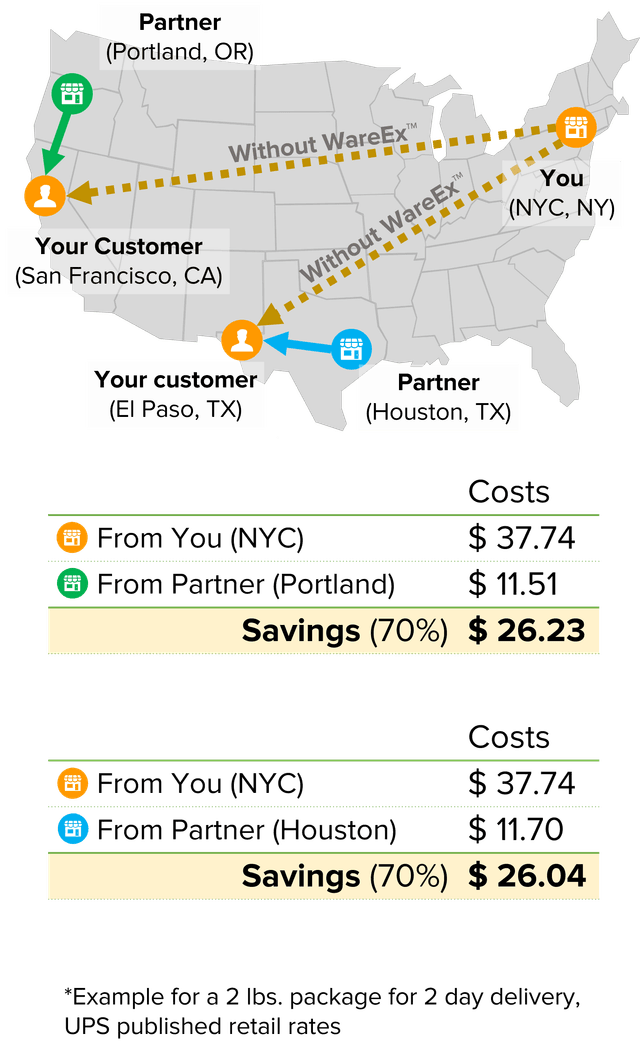 For the WareEx program, we compare the best-rate shipping costs that still meet the on-time delivery date SLAs from you and your partners’ location to the customer. Savings are the difference between the two rates and calculated using your existing negotiated rates.