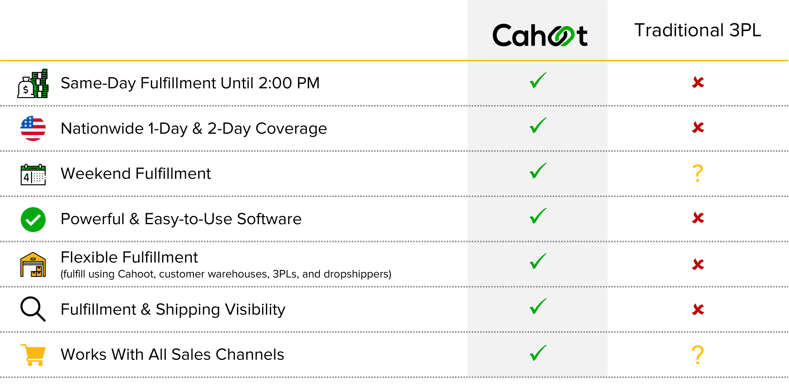 Nope! We’re happy for merchants to join our network just for fulfillment services. Though if you have extra fulfillment capacity and excellent metrics, you should apply to become a Cahoot Fulfillment Partner.