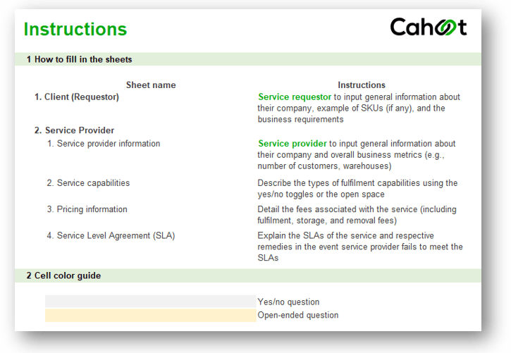Cahoot is an ecommerce order fulfillment network that helps merchants across many marketplaces and channels – from Amazon to Walmart to branded websites like Shopify & Big Commerce. This gives us special insights into what makes a 3PL partnership successful. We understand the frustration of brainstorming the details in an RFP and we’ve assembled a template to make sure you’re asking the right questions to a potential 3PL partner. In this file, you’ll get the questions you need to ask on:
