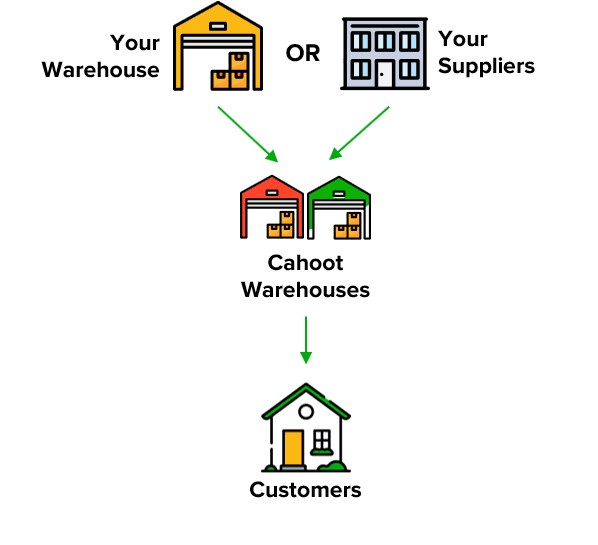 Merchants simply ship inventory to one or more warehouse locations in the Cahoot network. The Cahoot platform then automatically routes each order to the optimal shipping location where it’s fulfilled the same day.